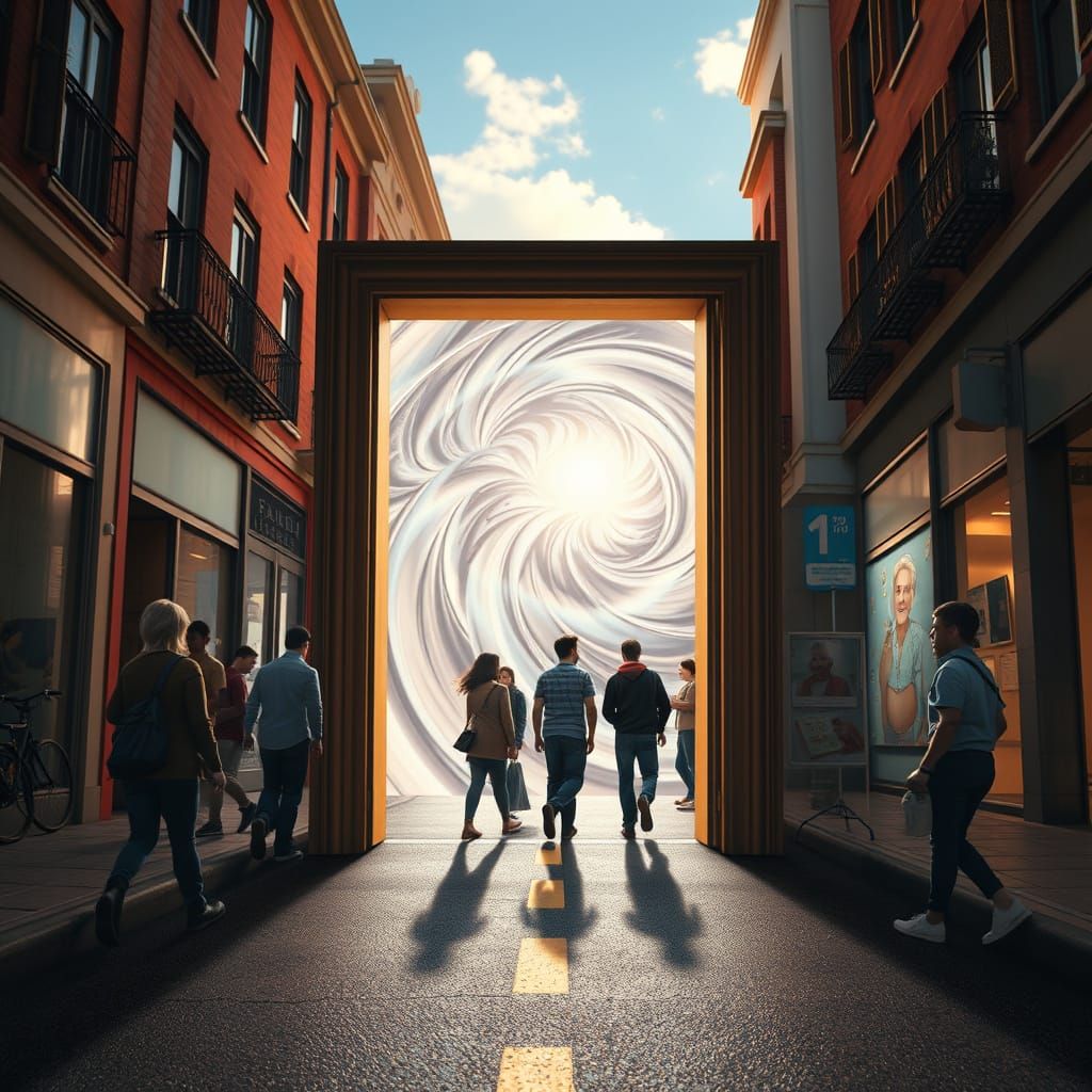 This image shows a surreal doorway in an empty street, beckoning people towards a swirling portal. Rendered with hyperrealistic detail and adorable character design reminiscent of Pixar.
