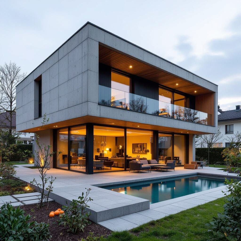 A modern two-story city villa featuring concrete and wood construction with large panoramic windows and terraces. A winter garden complements the design, set amidst a garden with a pool and fruit trees.