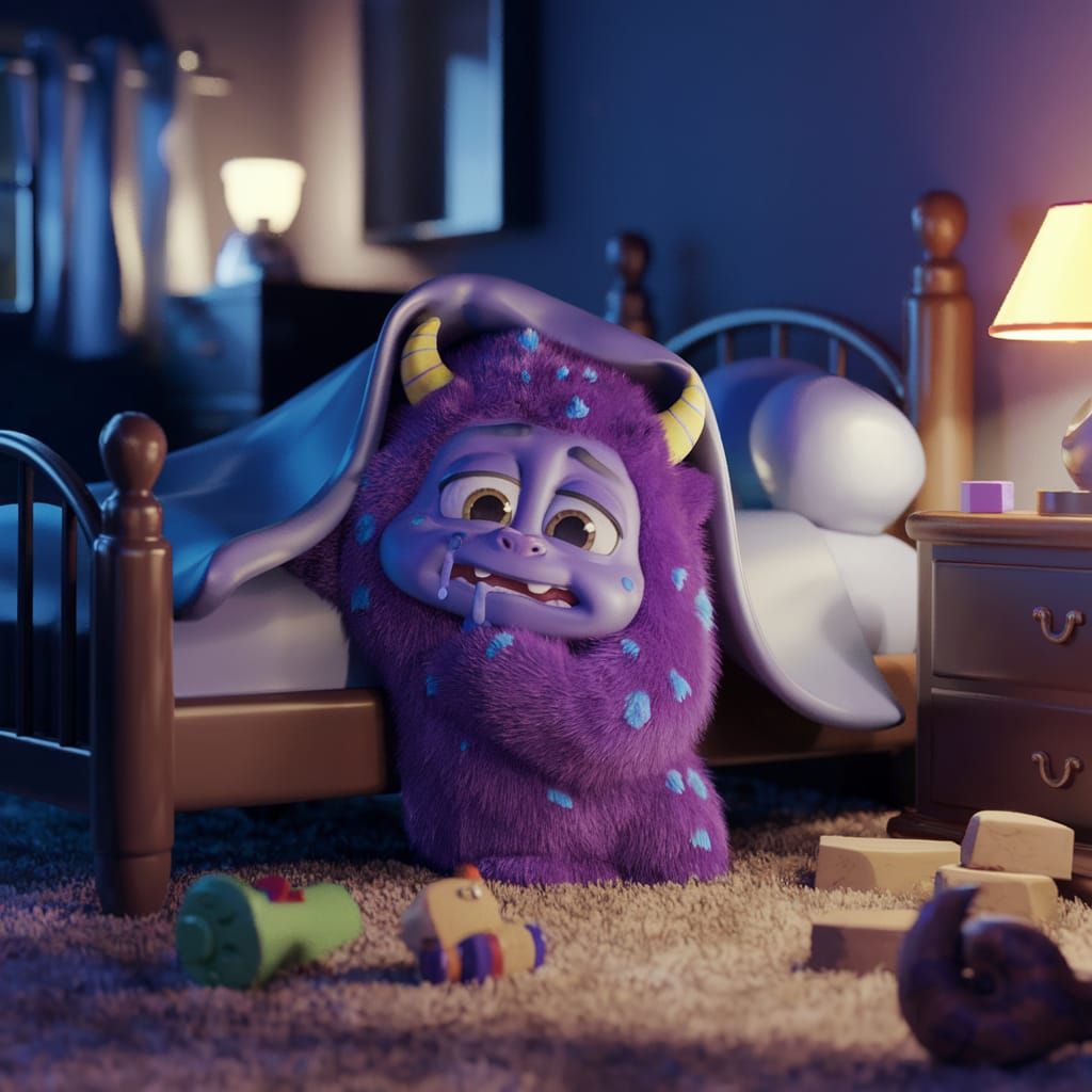This 3D cartoon image shows a sad, purple furry monster with blue spots crying while hiding under bed covers. The scene is a dimly lit bedroom with scattered toys, rendered in a detailed matte painting style.