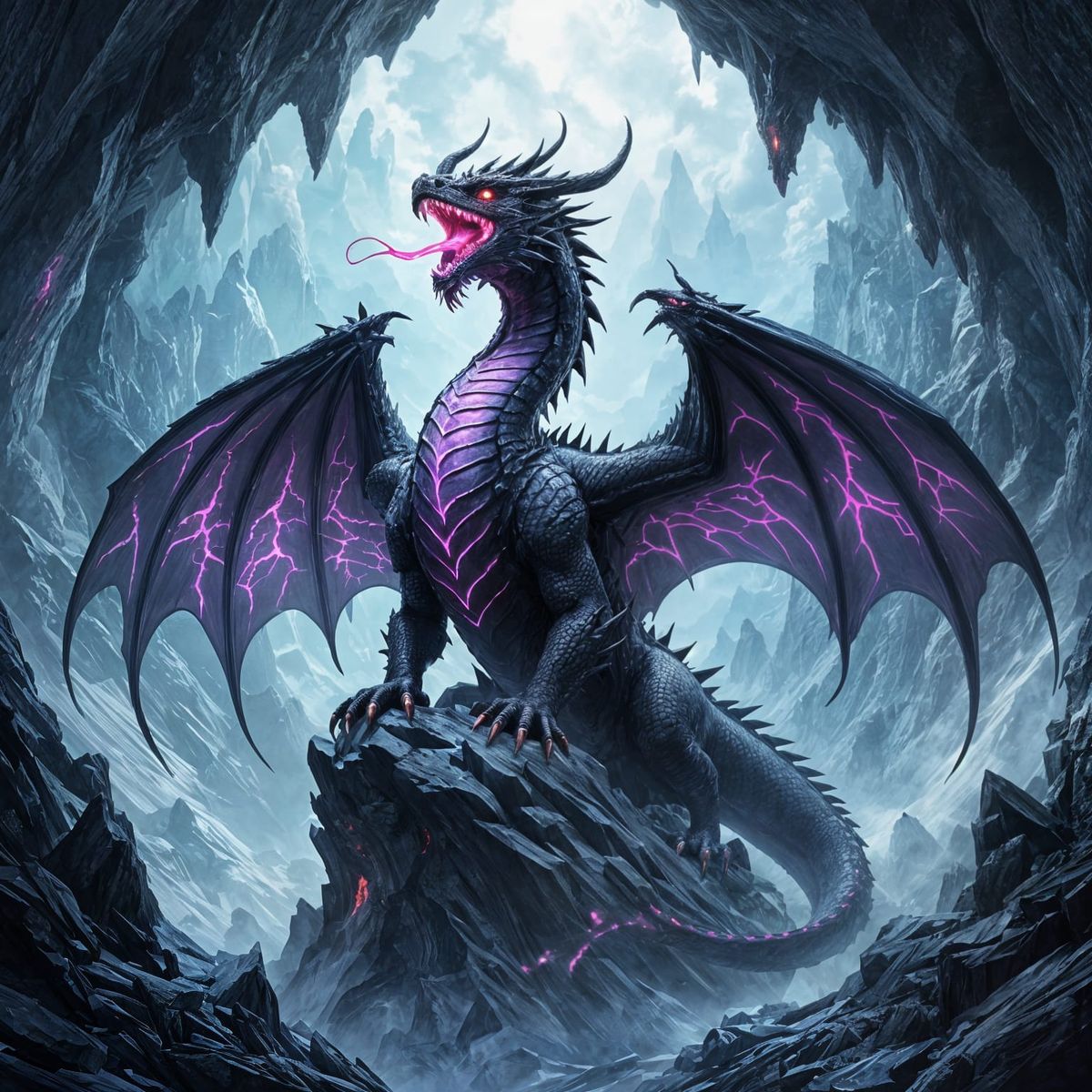 This digital fantasy illustration shows a majestic, black dragon with glowing energy veins perched on a jagged outcrop in a crystal cavern, mid-roar.