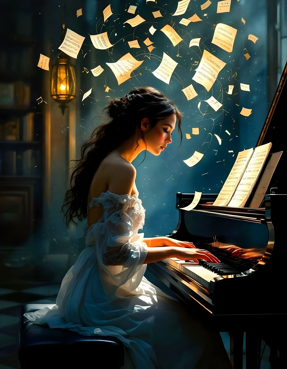 A close-up image of a musician playing piano with intense concentration. Musical notes swirl around her, illuminated by soft lantern light, set against a backdrop of lacquered panels.