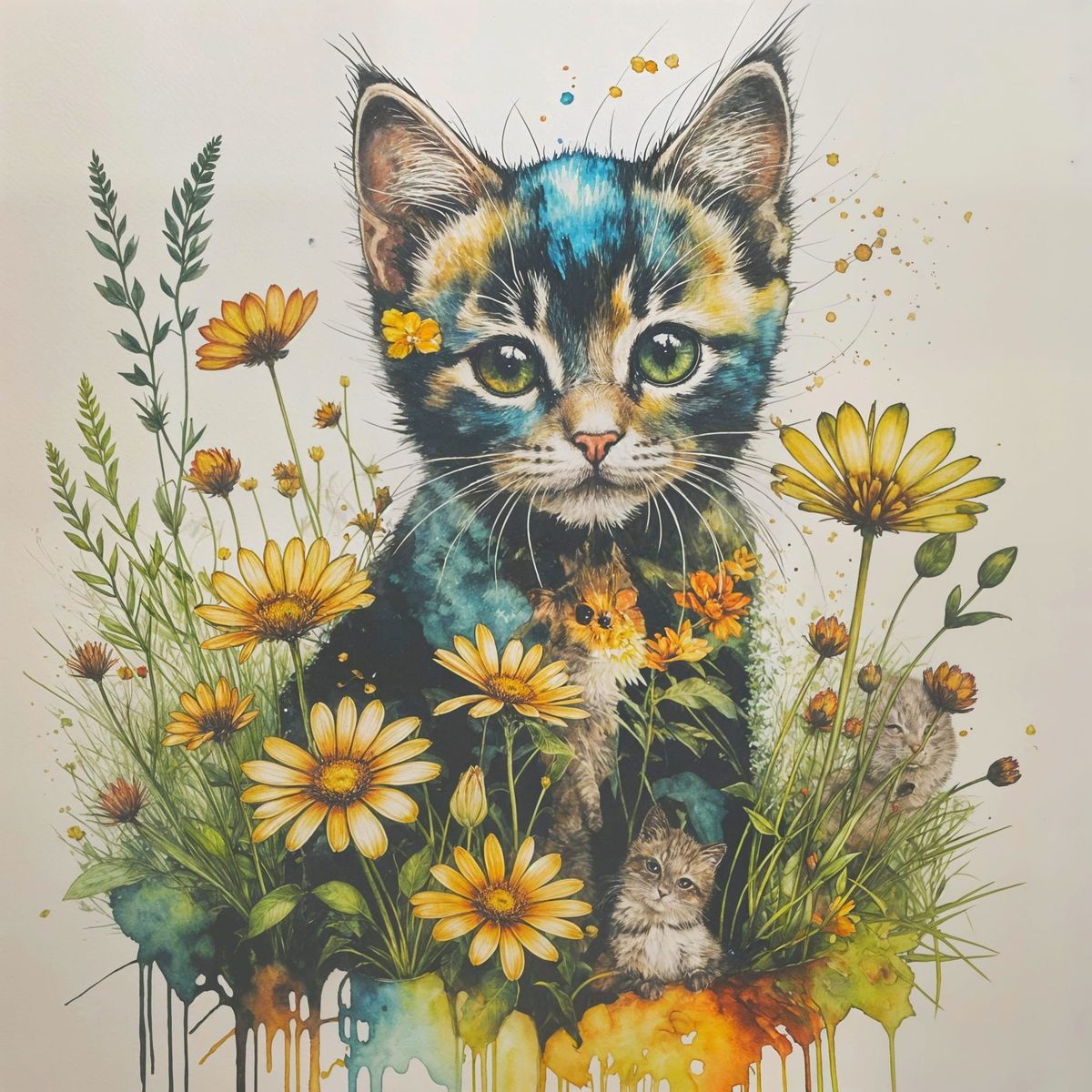 This image shows an adorable kitten as a double exposure, blending alcohol ink and watercolor art styles within a garden setting. A unique artistic interpretation.