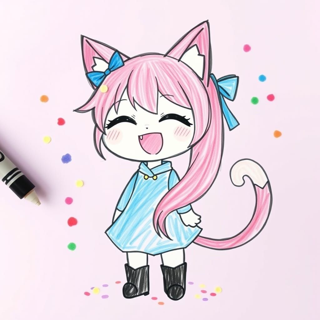 This image shows a childlike crayon drawing of an anime catgirl. The figure has pink hair, cat ears, a blue dress, and a joyful expression, set against a lilac paper background.