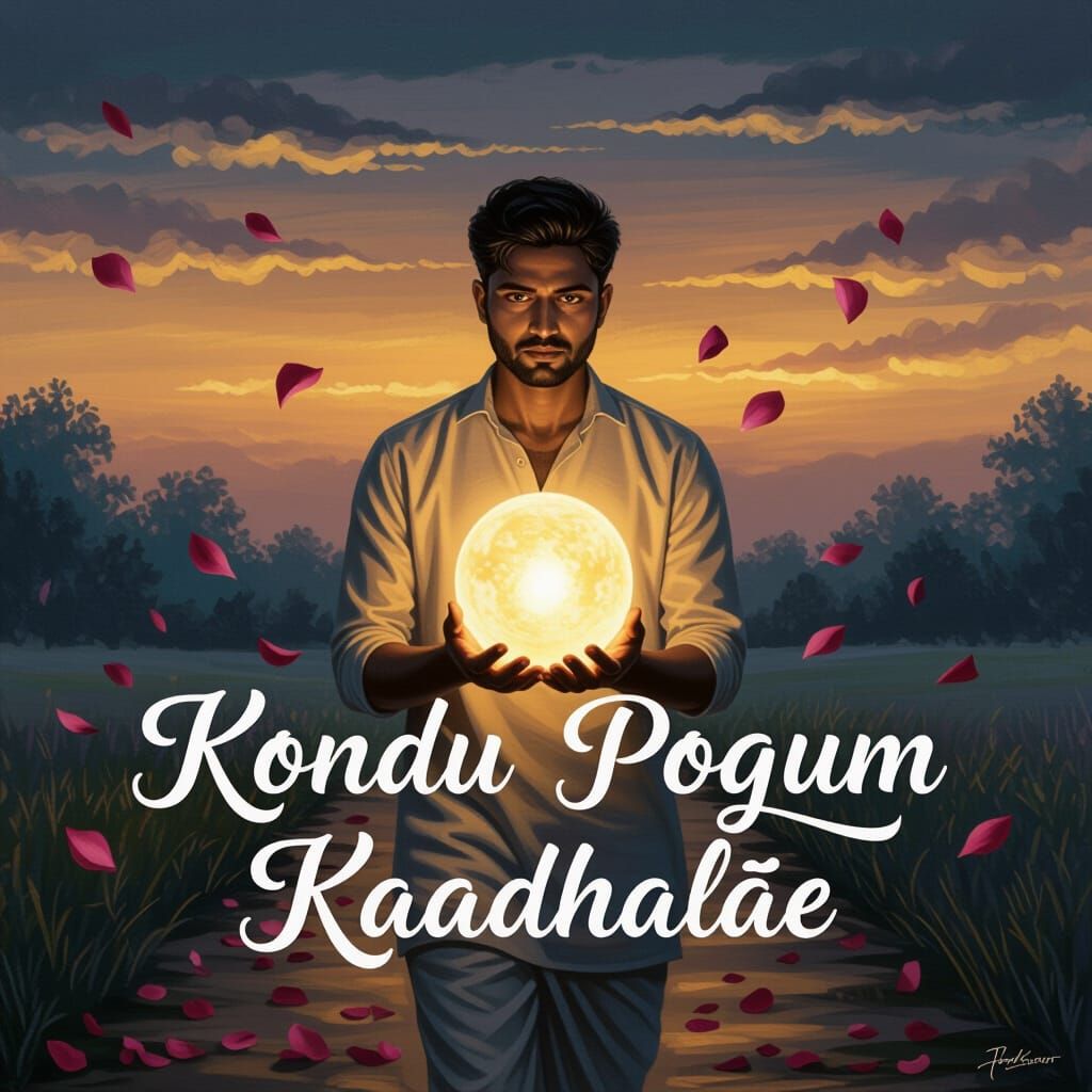 A cinematic painting of a South Asian man in a surreal, dreamlike landscape. He carries a glowing orb representing his love, with petals floating and the sky shifting colors. The mood is poetic and melancholic.