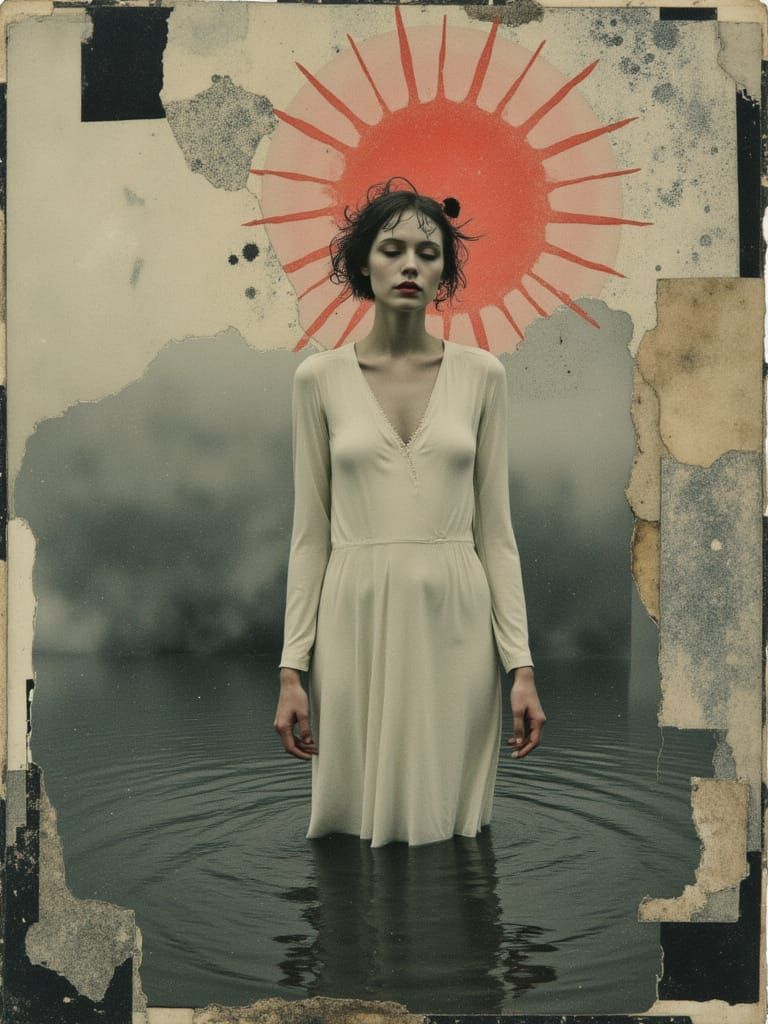 A haunting image of a deceased woman standing in the black water of a tarn on a foggy Cumbrian moor, depicted in a chaotic mixed-media collage style with gothic and retro-futuristic elements.