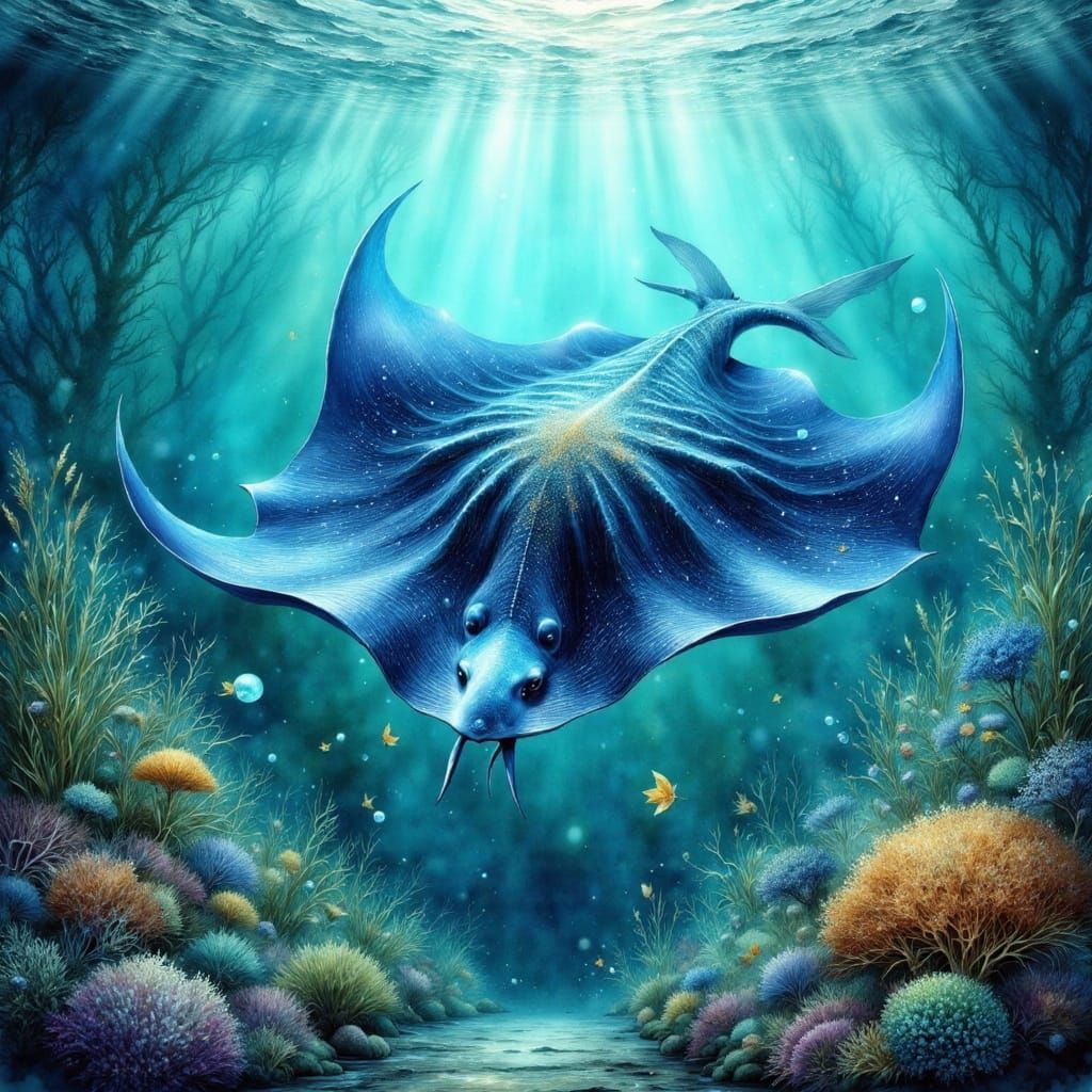 This image captures a serene underwater scene of a majestic stingray gliding effortlessly through crystal-clear turquoise water, surrounded by shimmering fish scales and delicate seaweed, in a vibrant and stylized watercolor aesthetic reminiscent of digital paintings and illustrations.