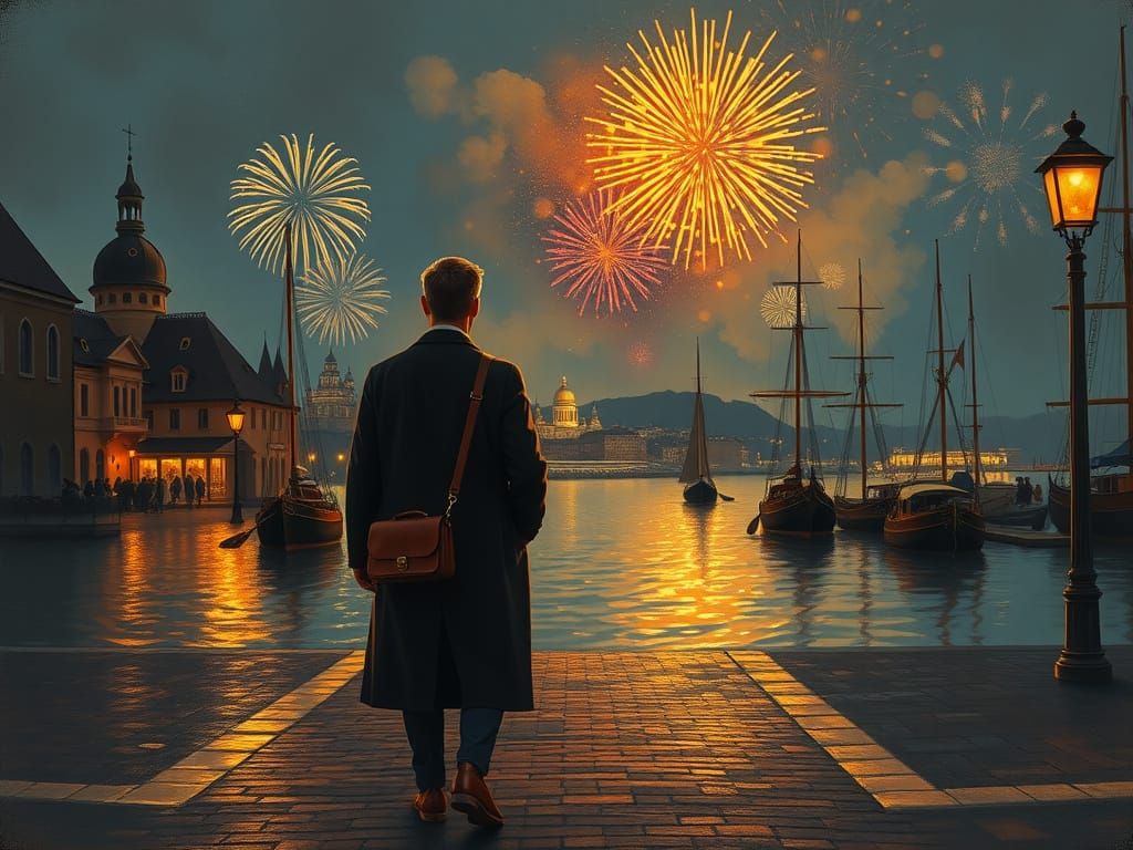 This image shows a lone figure walking toward a European coastal city at night. Fireworks illuminate the sky, reflecting in the harbor, with vintage streetlamps casting a warm glow in an oil painting style.