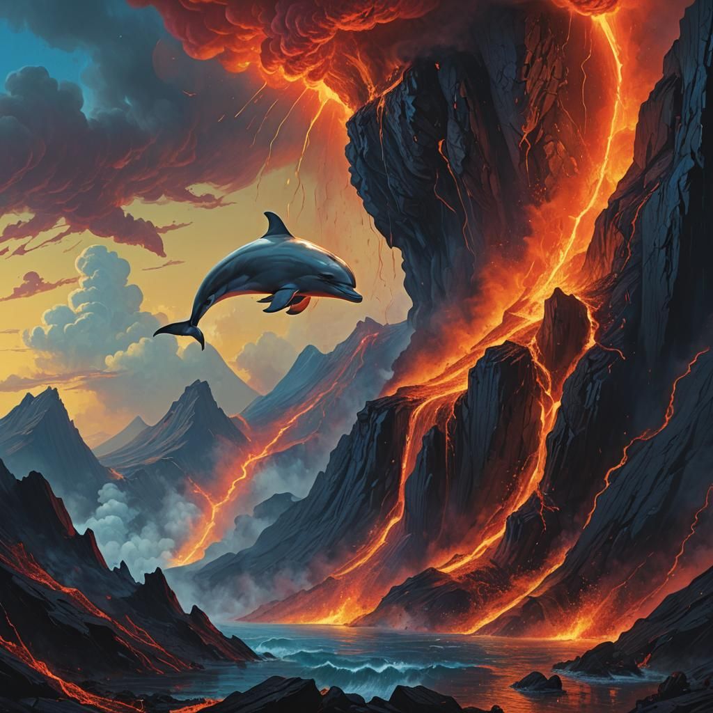 A vibrant matte painting of a dolphin leaping from a volcano. The image features glowing magma, intense sunlight, and contrasting shadows in a surreal, fantastical landscape rendered with bold colors and high-contrast textures.