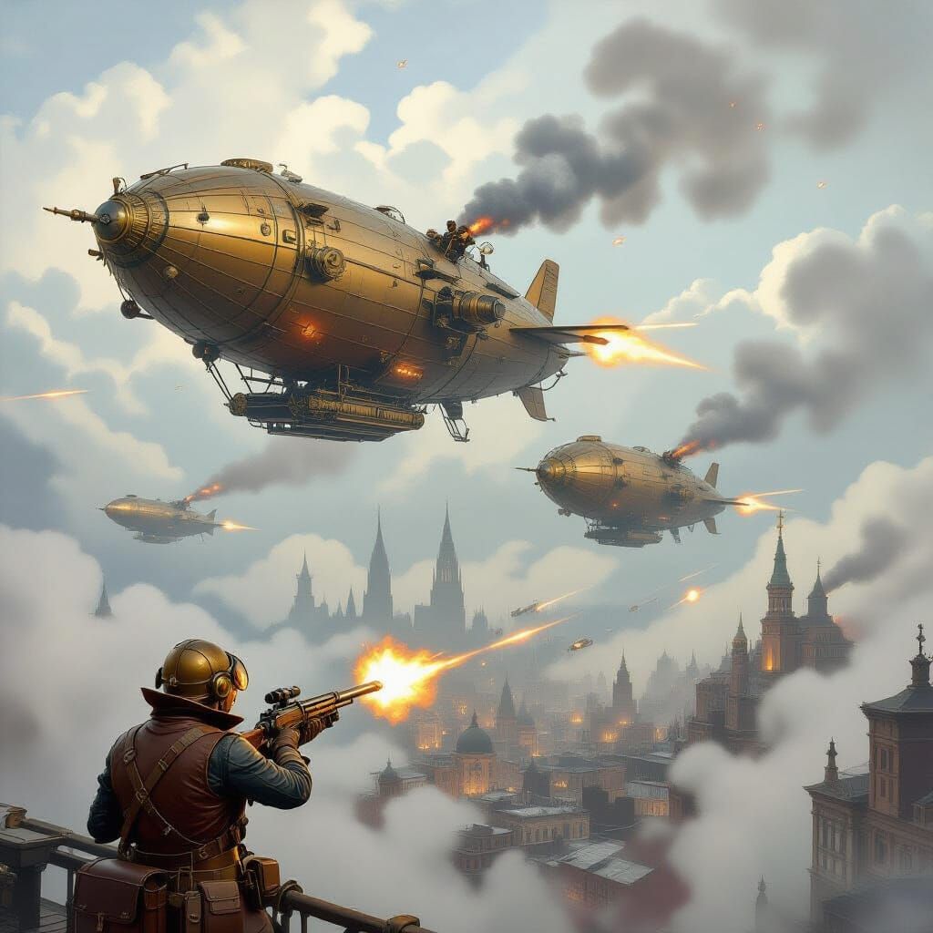 A dramatic scene of steampunk airships battling above a Victorian city. The image features intricate industrial details, vintage sci-fi elements and a retrofuturistic aesthetic.