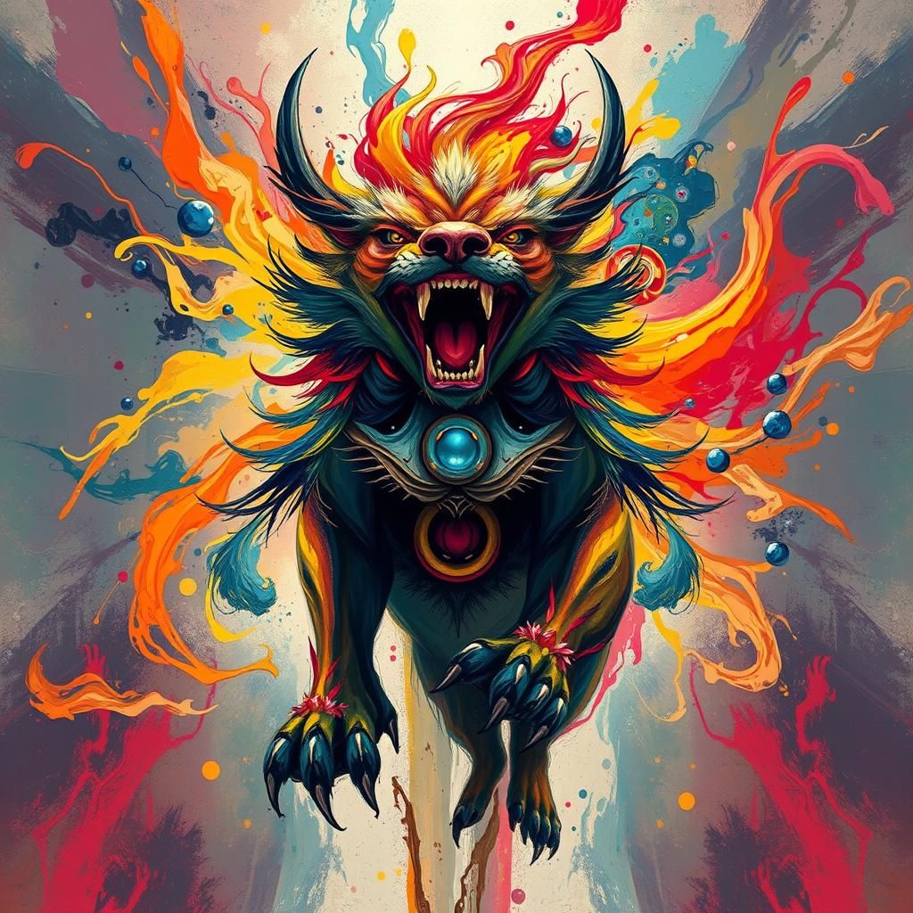 A vibrant, abstract image of a power animal. The artwork displays energetic brushstrokes and swirling patterns with a kaleidoscope of colors, in a stylized and dreamlike aesthetic.