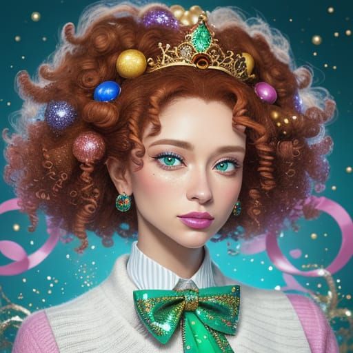 A vibrant digital art image of a woman with curly brown hair, wearing a pink cardigan and holding a champagne glass. The art style is colorful and glittering, with dramatic lighting and intricate textures.