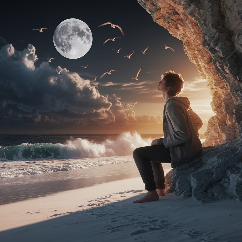 This image shows a solitary bohemian man gazing at a dark sky over a white sand beach on a rocky cliff. Seabirds circle above a turbulent sea under a vivid moon, rendered in detailed anime 3D art.