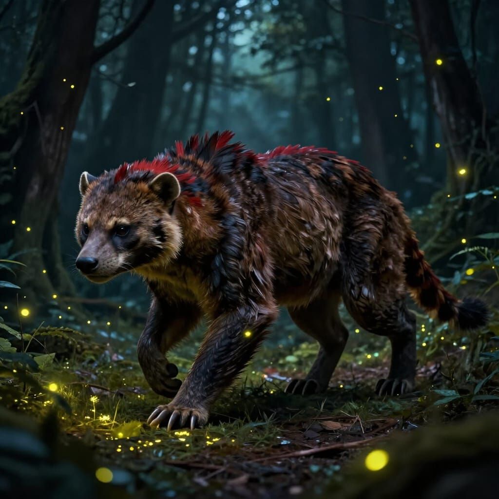 A large, muscular creature with reptile-like feathered features and sharp claws roams a dark, magical forest illuminated by glowing fireflies.