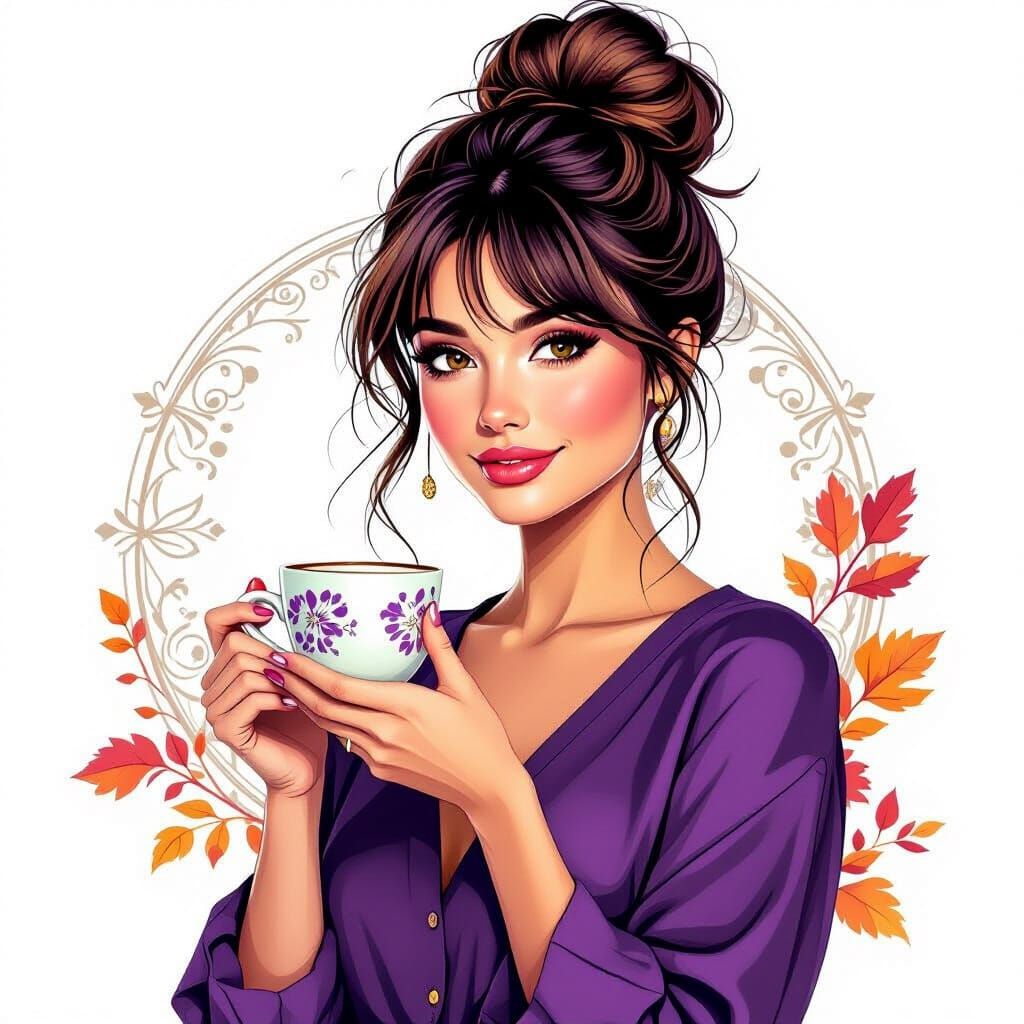 This image shows a beautiful woman with a coffee cup, surrounded by autumn foliage. The artwork is in a sfumato style with digital painting techniques, incorporating 3D shading and abstract fractal patterns.