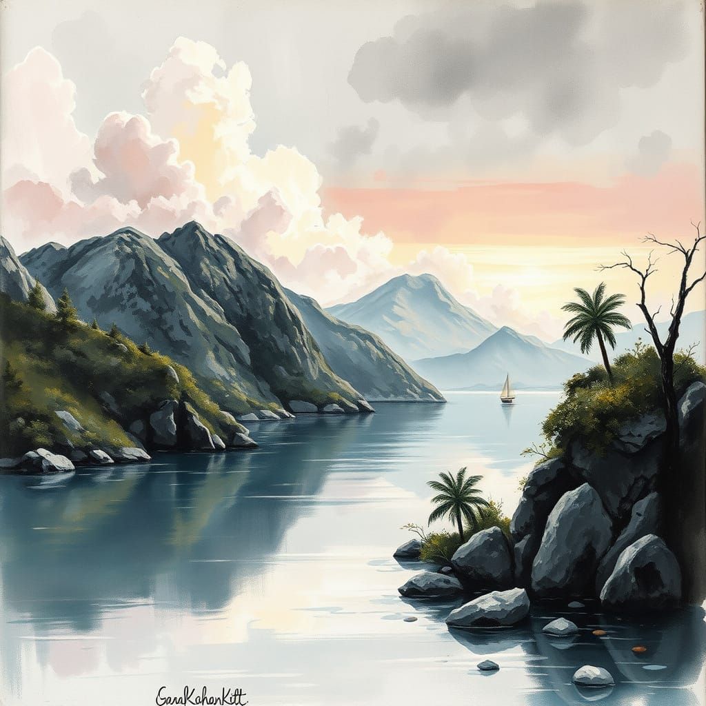 This image shows a serene landscape with dreamy vacation scenes, blending charcoal sketching with expressive Gouache and Watercolor styles. Characterized by thick brush strokes and impasto textures, it evokes the spirit of Epic Impressionism.