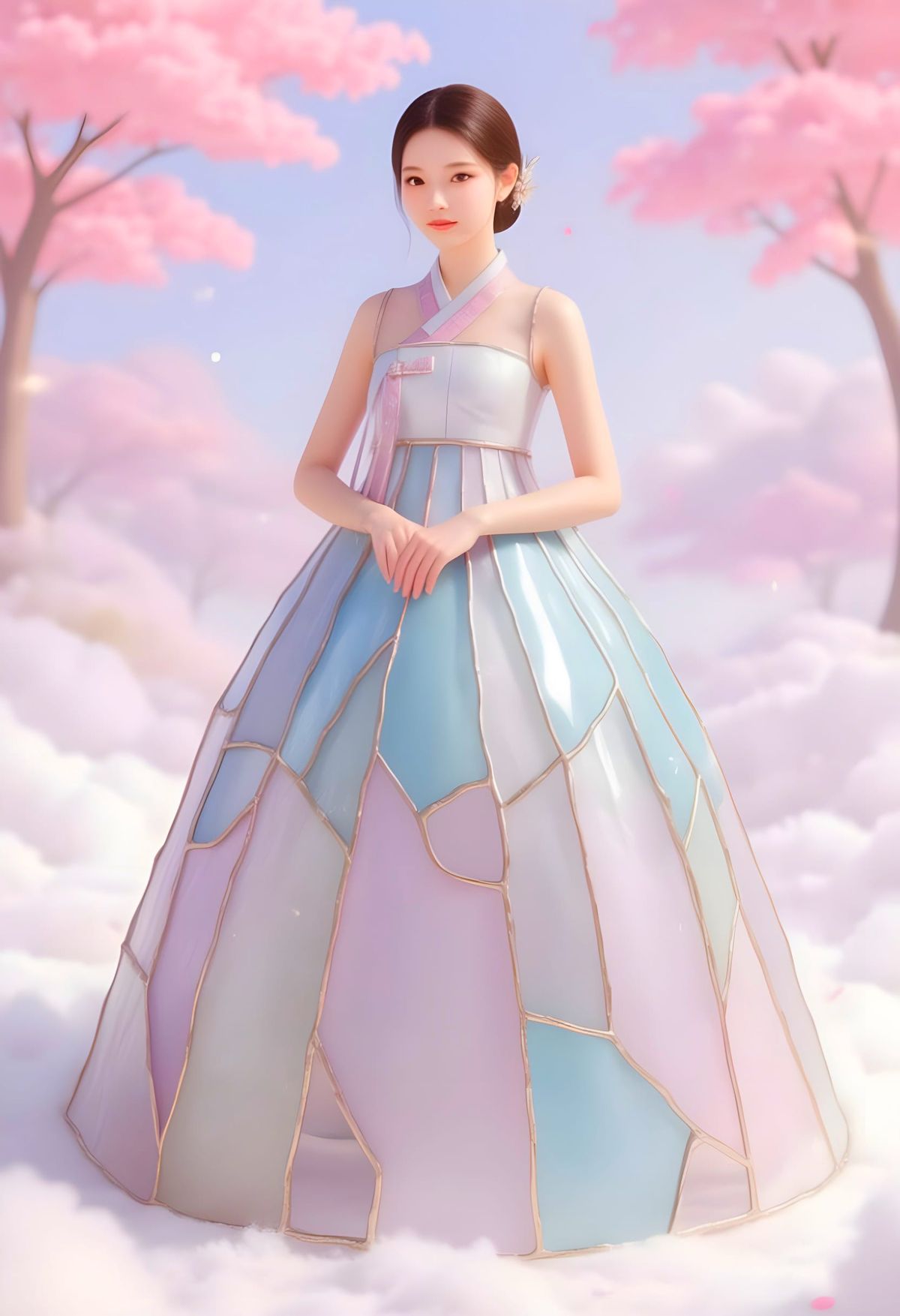 A dreamy pastel scene featuring a woman in an ethereal hanbok-inspired dress crafted from colored glass panels and metallic threads, set against a whimsical, cloud-filled background with soft, glowing light.