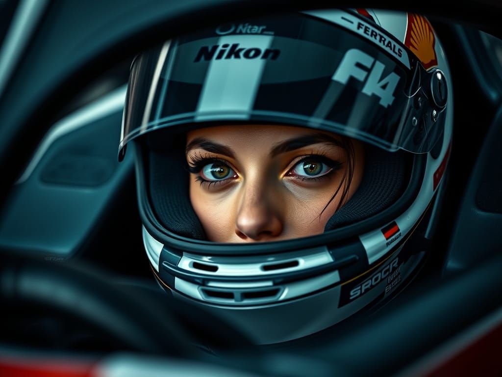 Brunette female racing driver, 24, sits in a sleek, futuristic cockpit, wearing a Formula 1-style helmet that is covered in sponsorship decals, face covered by her helmet and balaclava to reveal only her piercing green eyes, narrowed in determination, with dark eyelashes. High resolution sports photograph ...