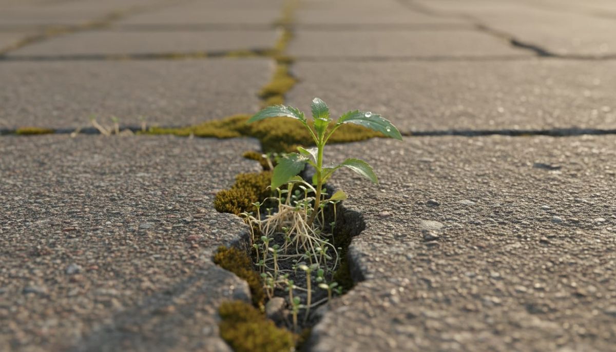 This image shows resilient green shoots and moss emerging from a cracked and crumbling sidewalk, symbolizing hope and survival in an unlikely environment. Life finds a way to grow.