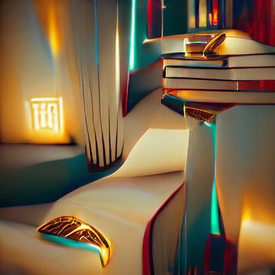 This image showcases a collection of books rendered as 3D Vray art in an art deco style. The artwork features maximalist design elements with volumetric lighting.