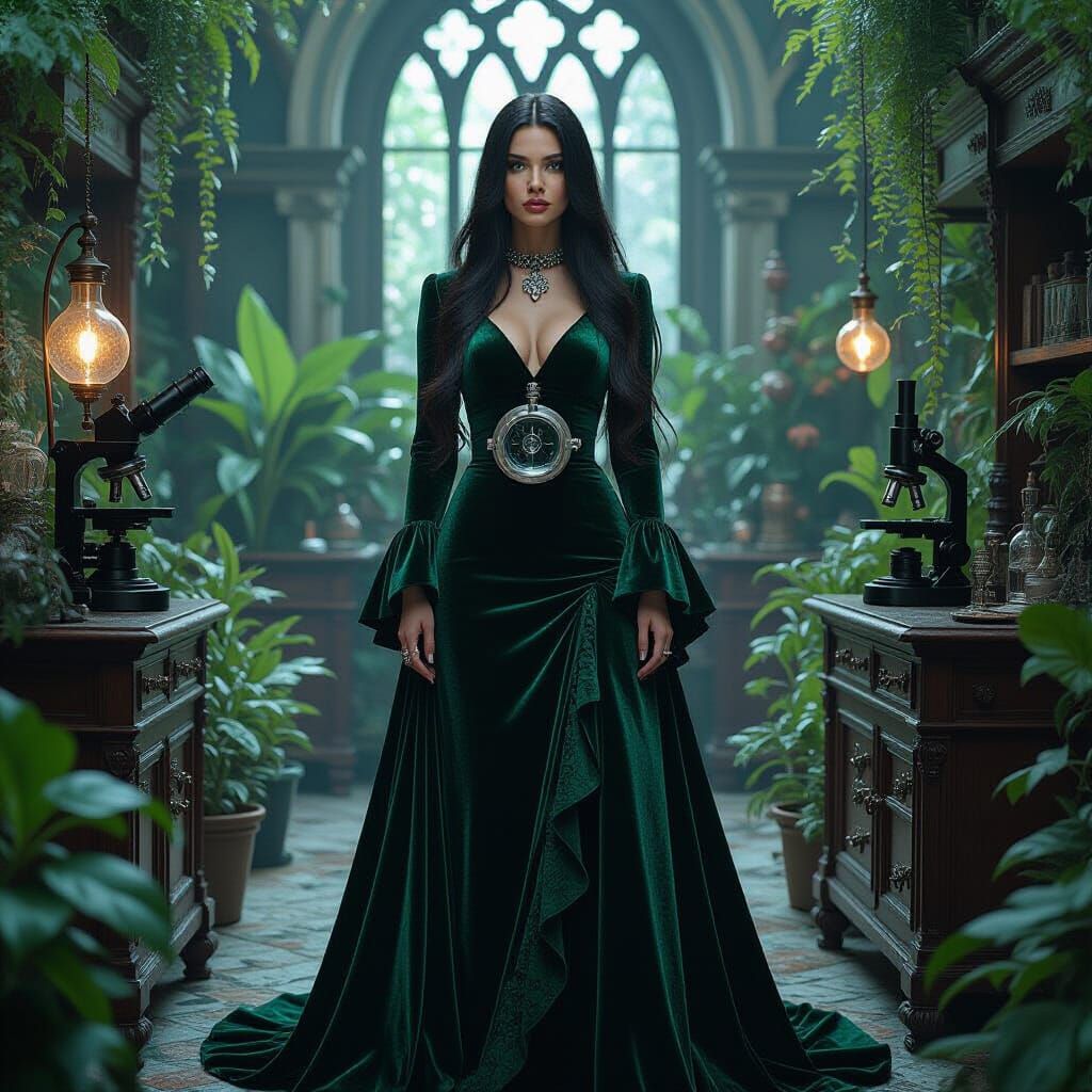 This image shows a gothic woman in an emerald gown in a bizarre botanical laboratory. The scene evokes a dark fantasy aesthetic with biomechanical elements and neon lighting.