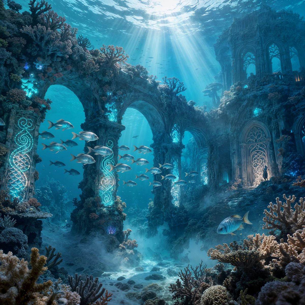 This image shows a vast, deep-sea coral palace adorned with glowing flora and ancient patterns. Fish swim through archways as sunlight filters down, creating a magical and mysterious underwater scene.