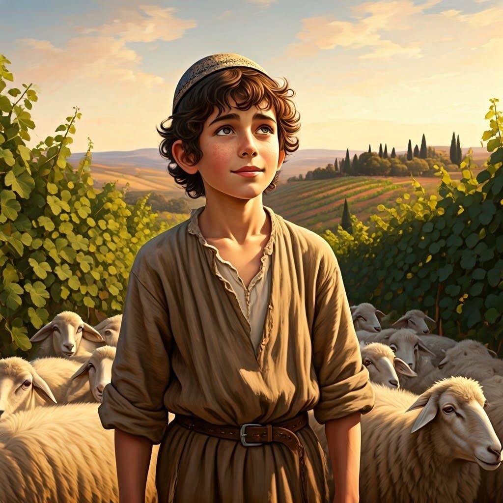 This image depicts a serene 17th-century-inspired scene of a young Hebrew boy guiding his flock, set against a backdrop of rolling hills and ancient vineyards, as he encounters a kind-hearted Jewish girl. The warm, golden light of the setting sun adds to the enchanting atmosphere, reminiscent of Rembrand...