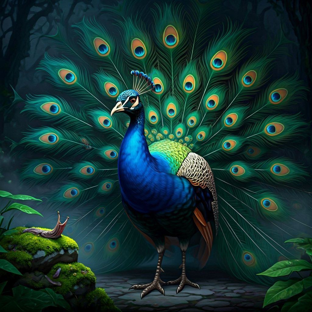 “On the 20th day of Halloween, emerges Ash, the eerie peacock whose elegance hides a haunting secret. His feathers gleam in shimmering shades of blue and green, cascading like liquid moonlight. From his head rise two pointy ears, giving him a mysterious, almost mythical look. His yellow beak glows faintly in the dark, and his orange eyes burn with a supernatural light, piercing through the mist of midnight. Ash loves to feast on slugs, which he plucks from mossy stones and dew-drenched leaves in his foggy, haunted garden. When he spreads his tail, the glowing eyes on his feathers seem alive—watching, flickering, and whispering secrets of Halloween past. His eerie call echoes like ghostly laughter through the night, sending shivers down the spine of anyone who dares to listen.”