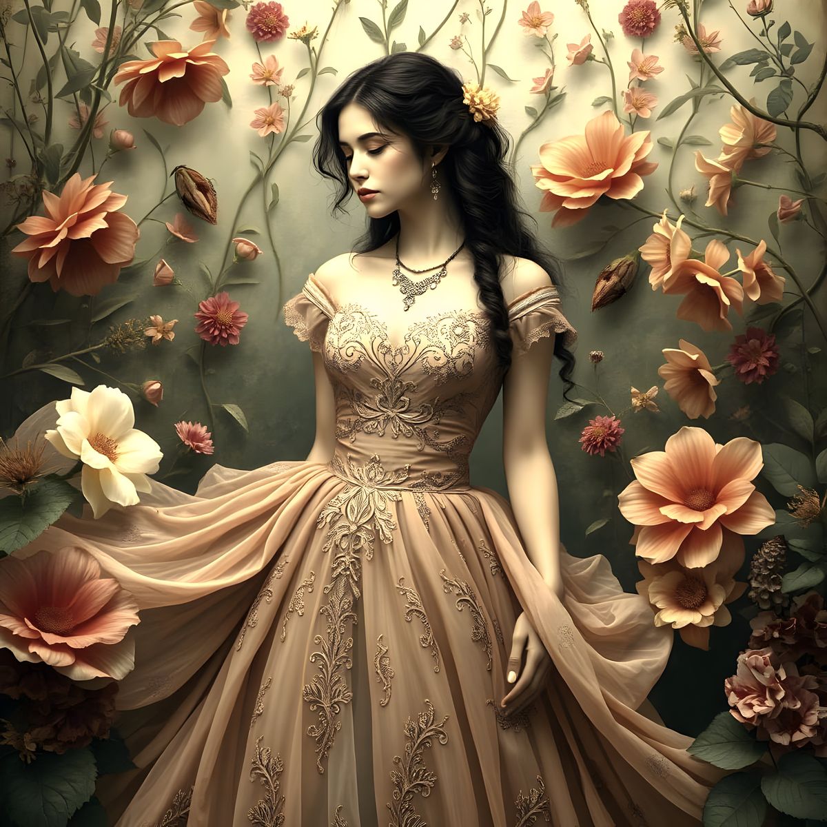 This image shows a hauntingly beautiful portrait of a person surrounded by symbols of love and inner demons, set against a dreamlike backdrop of a mysterious landscape.
