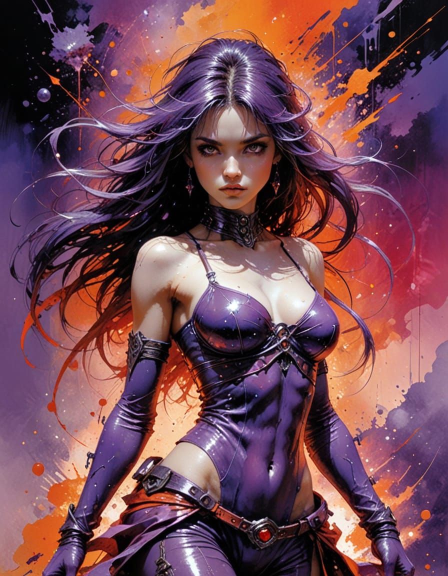 A vibrant abstract artwork featuring a blend of purple, pink, orange, and red hues. The piece showcases fine details and complementary colors in an abstract style.