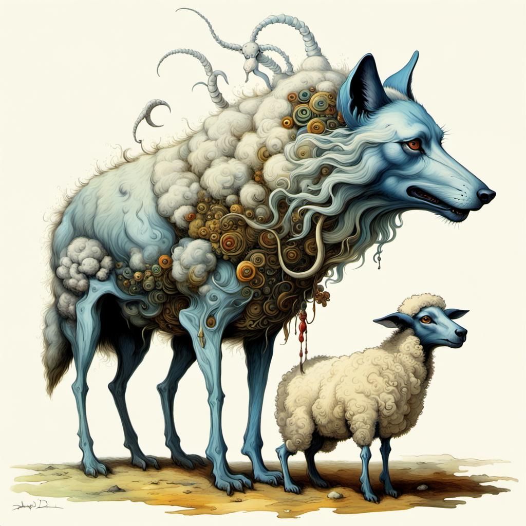 A surrealist painting of a wolf-sheep hybrid. The artwork features fantastical elements, intricate details, and a maximalist, fractal-rich rendering reminiscent of surrealist and fantasy art.