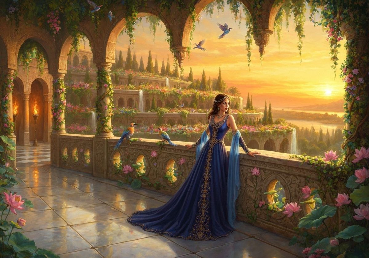 This image shows a queen in a sapphire gown overlooking the Hanging Gardens of Babylon at sunset. The image is an oil painting with thick brushstrokes and rich colors.