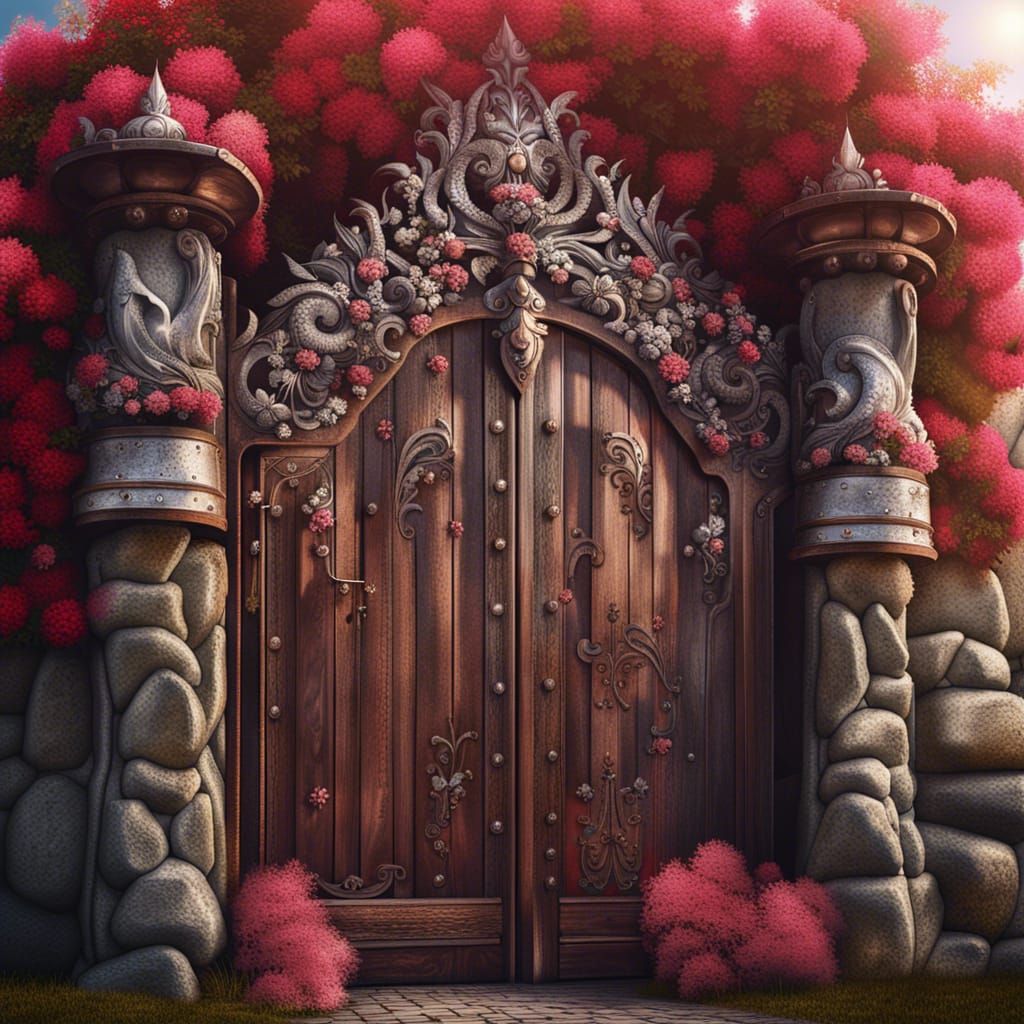 A photorealistic image shows a wooden castle gate adorned with silver and vibrant metal flowers. Red, white, and pink flowers climb the gate in this cinematic fantasy concept art.