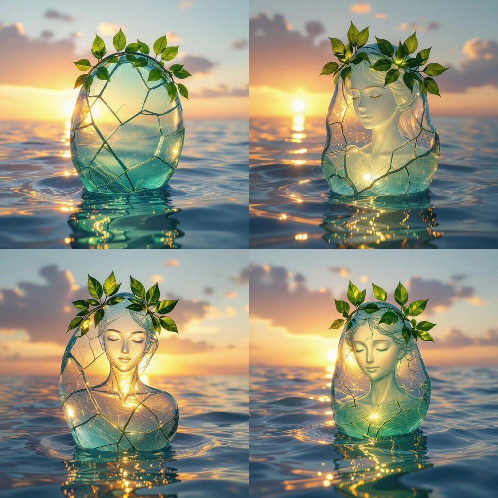 A cinematic sculpture of a translucent soul rising from ocean waters at sunset, crowned with glowing green leaves. Cracked yet radiant, this sea glass figure glows with inner light, reflecting resilience, serenity, and emotional depth. Surrounded by mist and pastel skies, the scene evokes healing, hope, and ethereal beauty. Inspired by WLOP and Genshin Impact, crafted in fantasy realism with ultra-detailed textures and cinematic lighting.