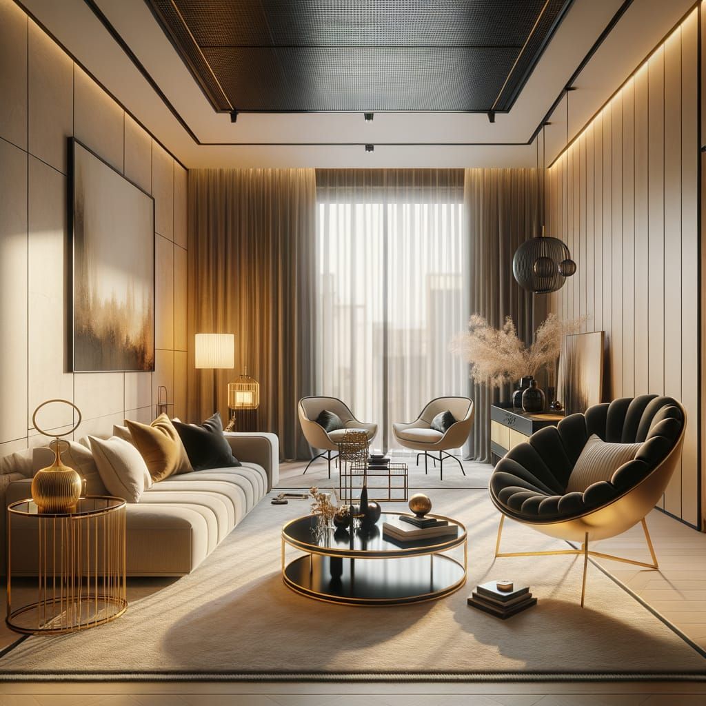 This image shows a modern living room with beige walls and a neutral color palette. The room features an ivory rug, a gold-and-black accent chair, and warm lighting, rendered as a detailed matte painting.