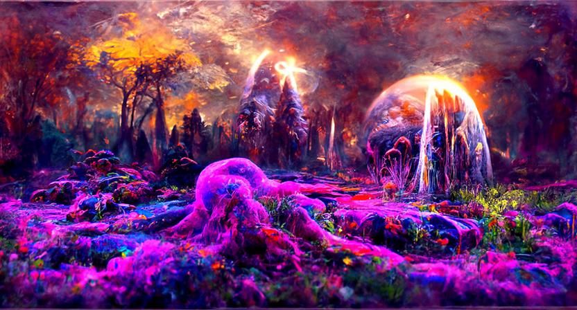 A surreal and otherworldly landscape with iridescent and cosmic elements. The scene features a variety of strange and unnatural flora in a deep purple, eldritch style, rendered as airbrush art.
