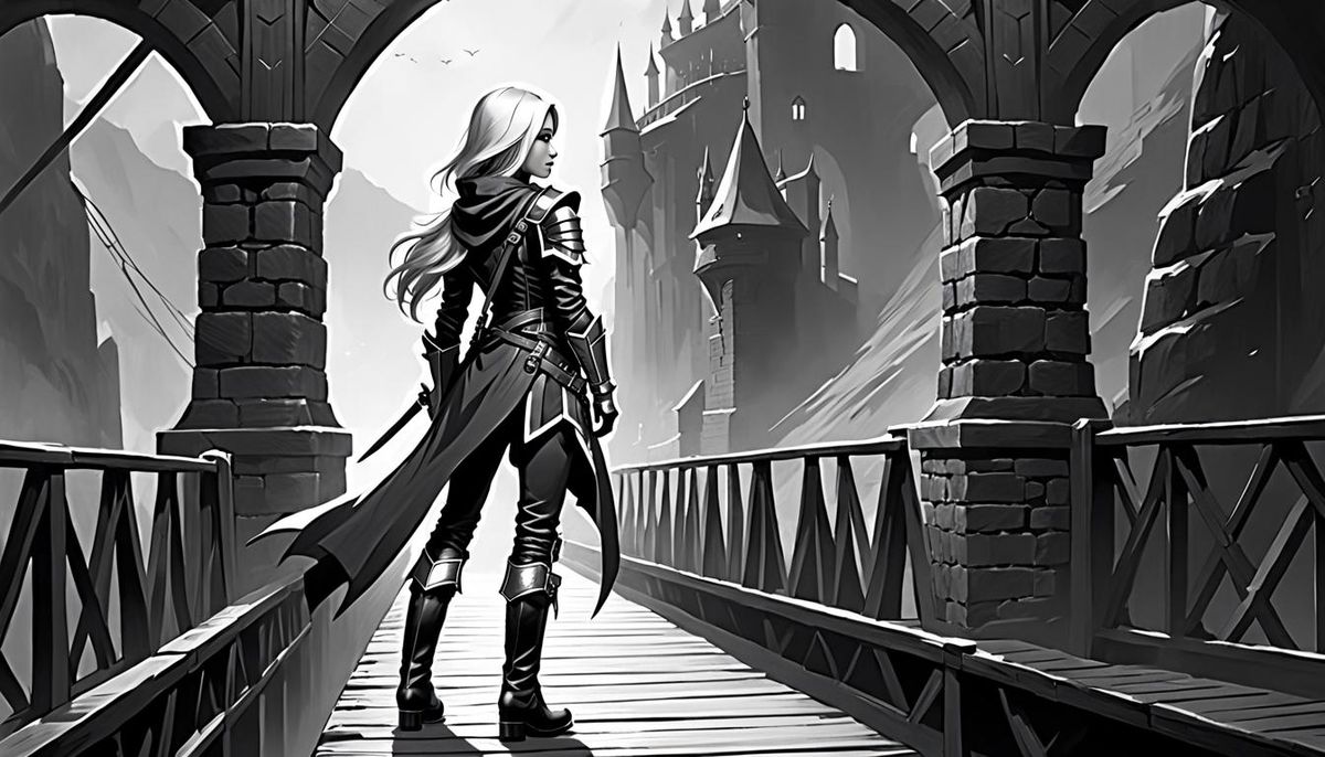 A black and white pencil sketch of a female rogue in a dark fantasy setting. The image depicts a lone figure in leather armor and boots, leaning against a bridge at night.