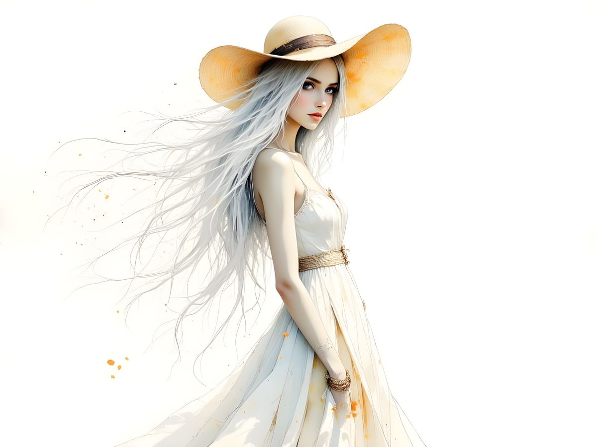 <lora:minimalism:1.0> <lora:Hand Drawn Bohemian:1.0> <lora:Jeweled:1.0> <lora:Earth and impression:1.0> Dungeons&Dragons style, a young, tall, slim, and beautiful maiden with a wild mane of pure white hair. Full body. Minimalistic. She is pale, has a small waist and voluptuous shape. She has blue eyes ...