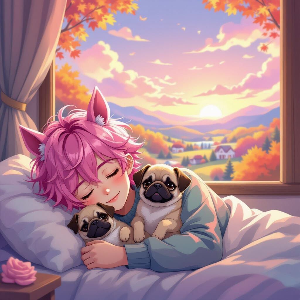 A graceful anime boy with pink hair and horse ears sleeps with a pug puppy, bathed in soft violet light. Features a Candyland wonderland aesthetic with gouache textures.