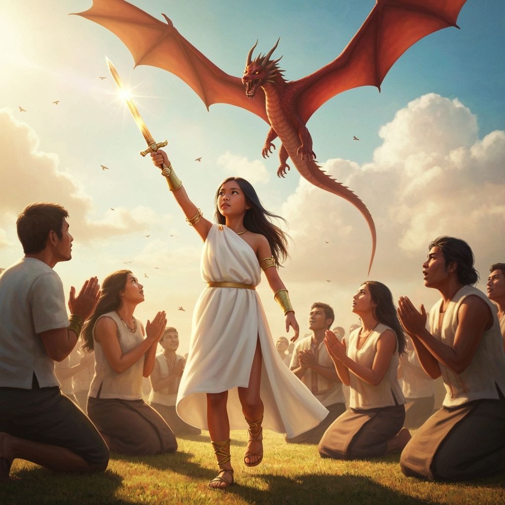 This image shows a young woman with a golden sword being worshipped by kneeling villagers as a red dragon flies overhead. The scene is filled with intense sunlight and cinematic colors.