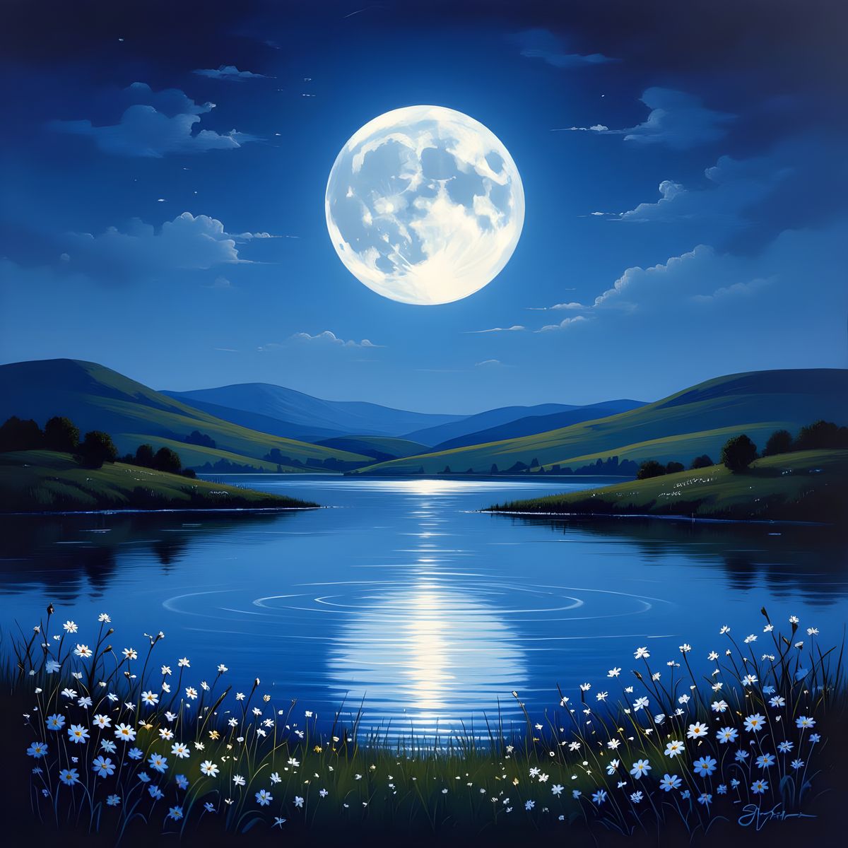 This oil painting captures a tranquil lake reflecting a luminous full moon, surrounded by gentle hills and wildflowers. Features refined chiaroscuro and intricate brushwork.