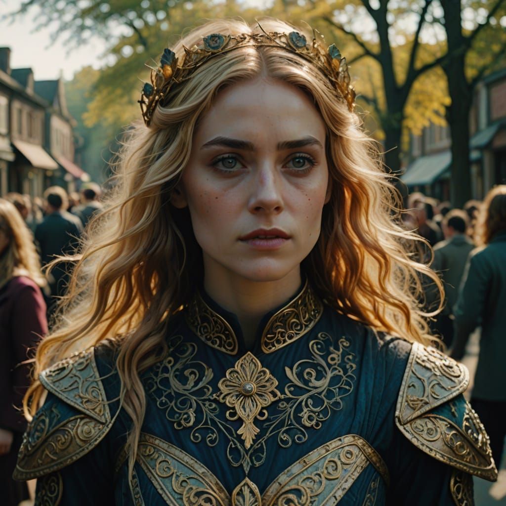 This image shows a hyperrealistic film still of a 28-year-old Irish banshee in an elaborate costume. The portrait features golden blonde hair, gleaming brown eyes, dramatic lighting, and a vibrant triadic color scheme.