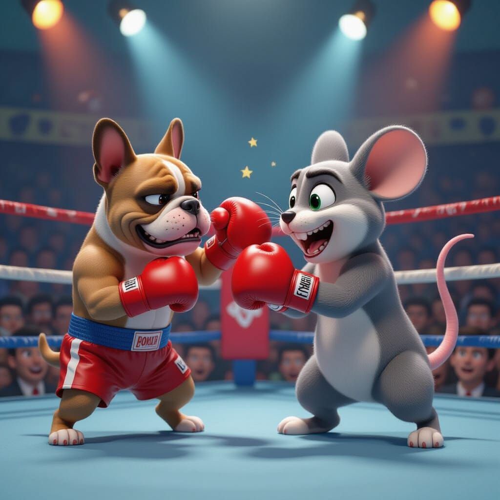 This image shows a powerful French Bulldog boxer delivering a knockout punch to a scammer mouse in a vibrant boxing ring, rendered in a dynamic 3D animation style.