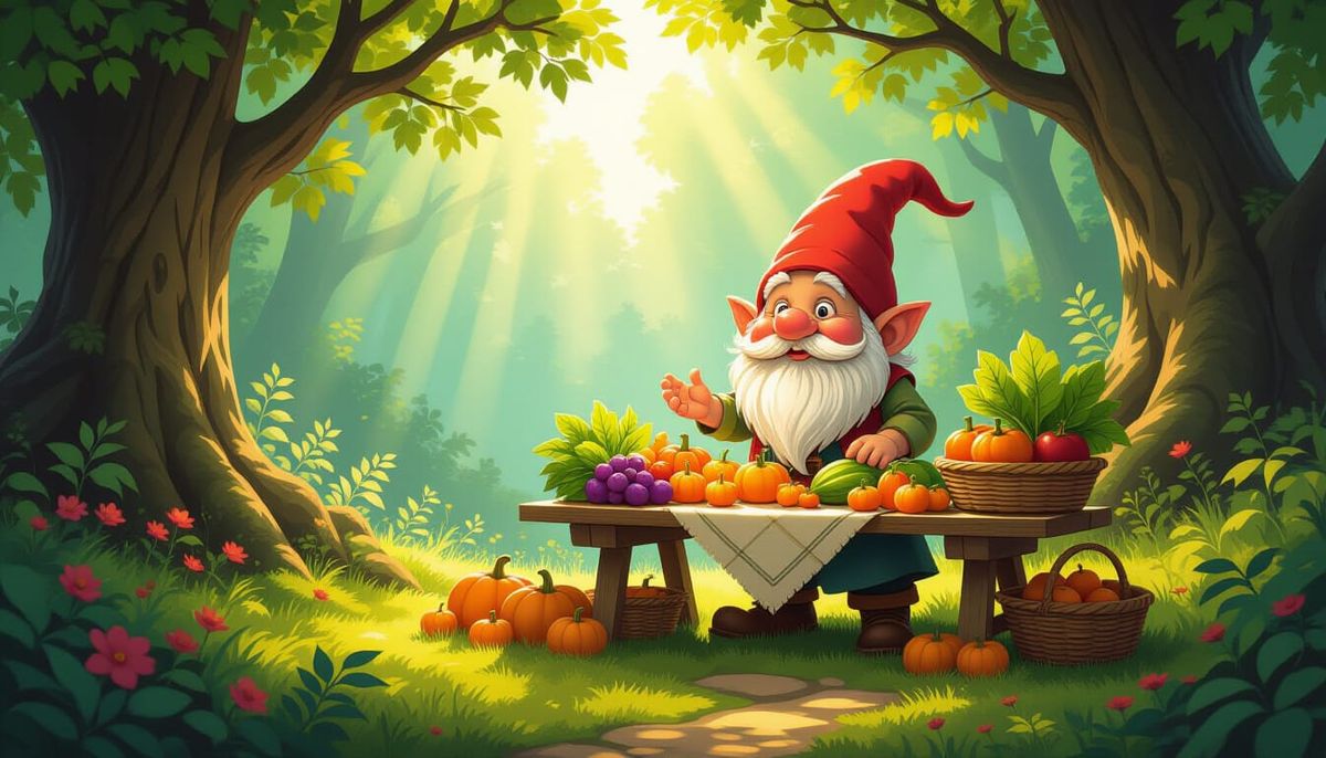 This image depicts a cheerful gnome overseeing a bountiful harvest table in a sunlit, enchanted forest clearing. Rendered in a painterly fantasy illustration style with vibrant storybook colors and cinematic lighting.