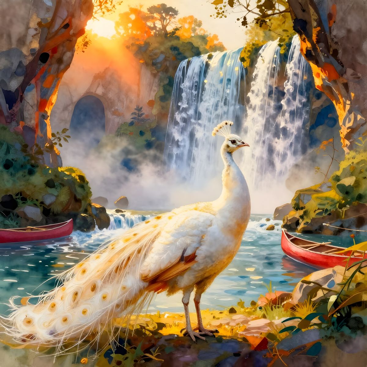 This image shows a white peacock by waterfalls at sunset, rendered in a loose watercolor style with bleeding colors and visible brushstrokes, evoking a dreamy, misty atmosphere with warm light.