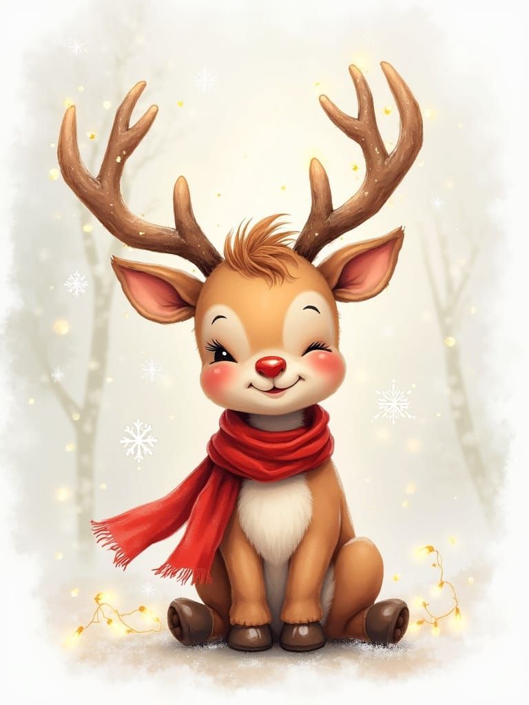 A watercolor style image shows a baby reindeer wearing a red scarf, surrounded by snowflakes and fairy lights. This cozy Christmas nursery scene is rendered with hyperdetailed mist.