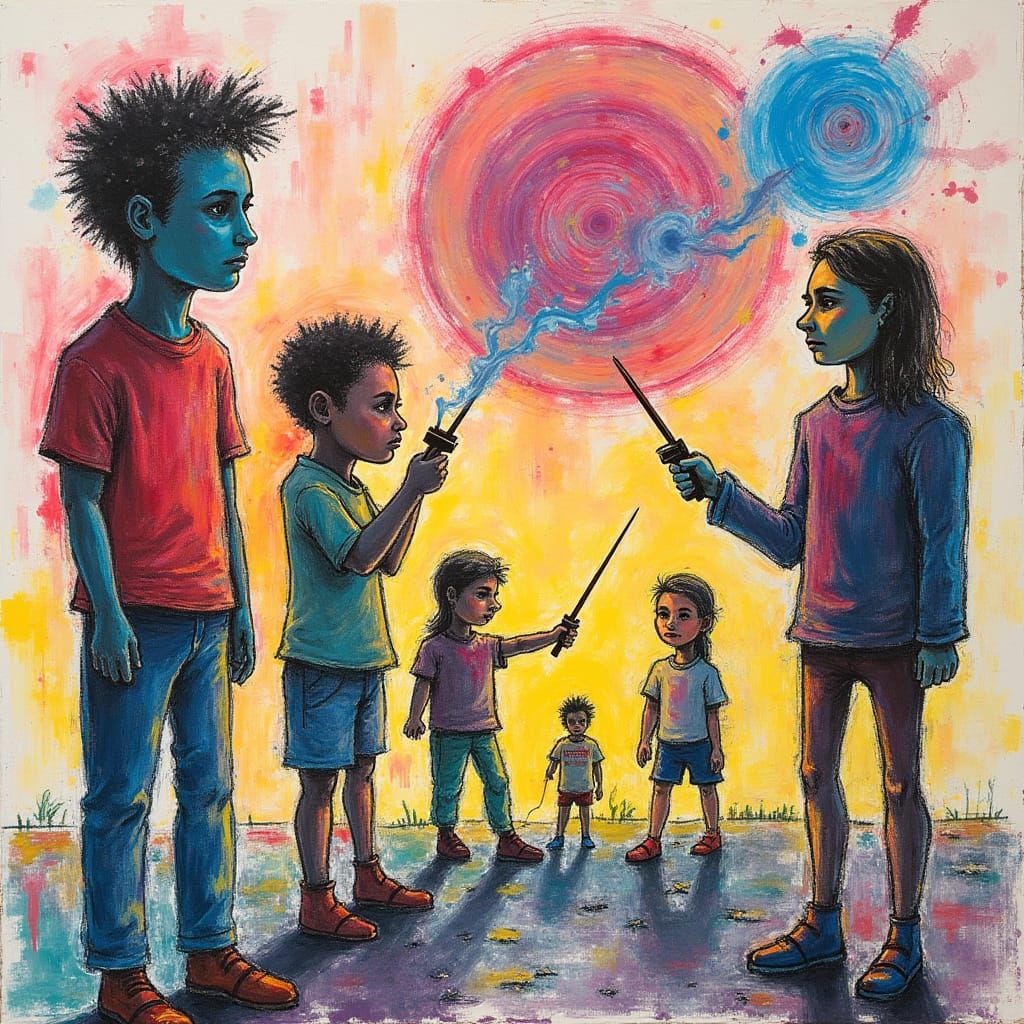 This dreamlike image showcases a kaleidoscope of colors, blending crayon marks and ink splatters in a vibrant, rainbow-hued geometry. Inspired by the styles of Basquiat and Man Ray, it captures the unpredictability of abstract expressionism and playful geometry.