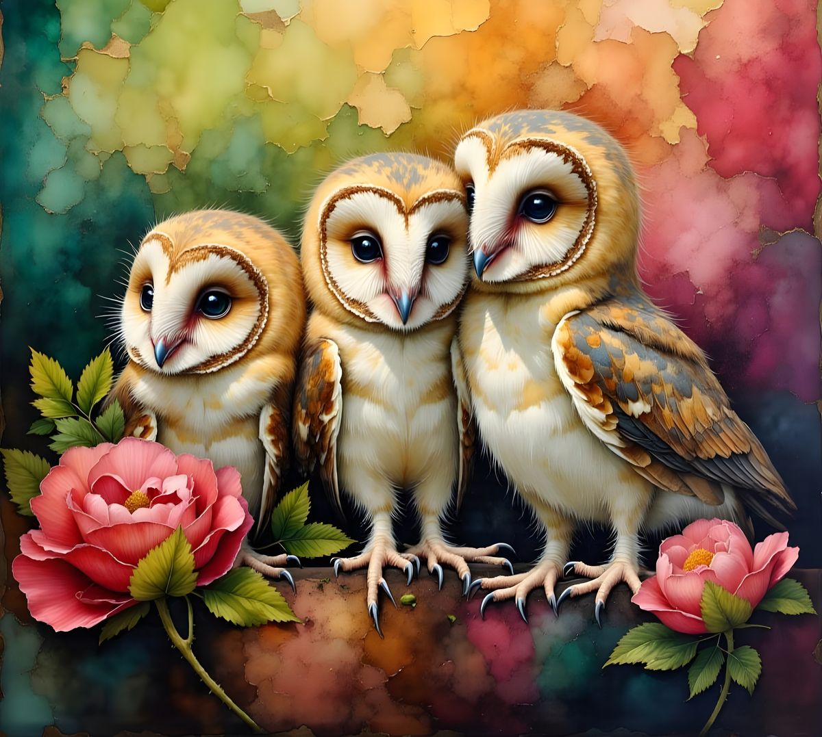 A striking picture of three baby barn owls awaiting their next meal. The image showcases vibrant colors and soft bokeh in an impasto oil painting style with volumetric textures.