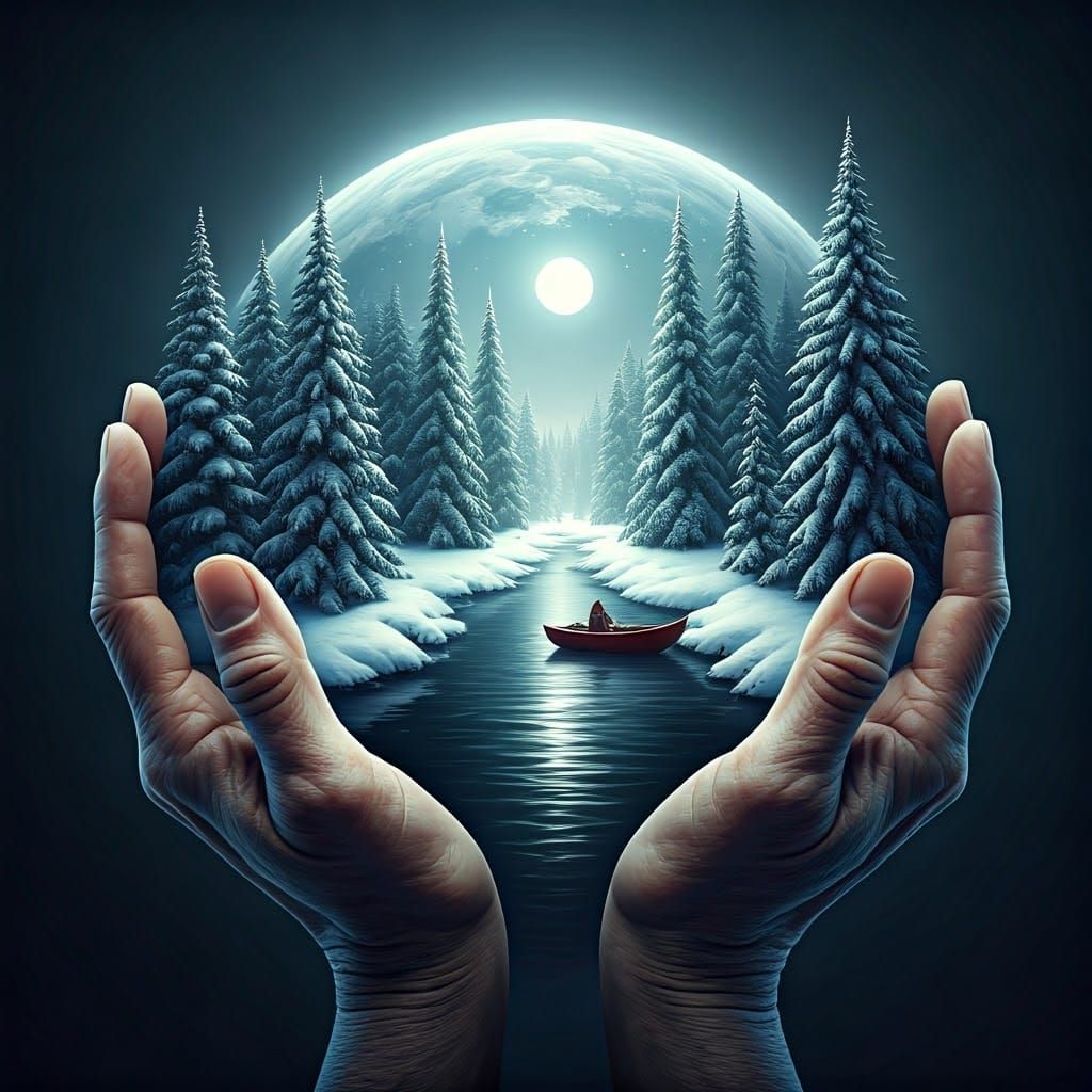 This serene image depicts a frozen winter scene, set amidst a snow-covered evergreen forest, with a frozen river flowing gently, and a small boat drifting peacefully under the soft light of a full moon, evoking a sense of peaceful tranquility
