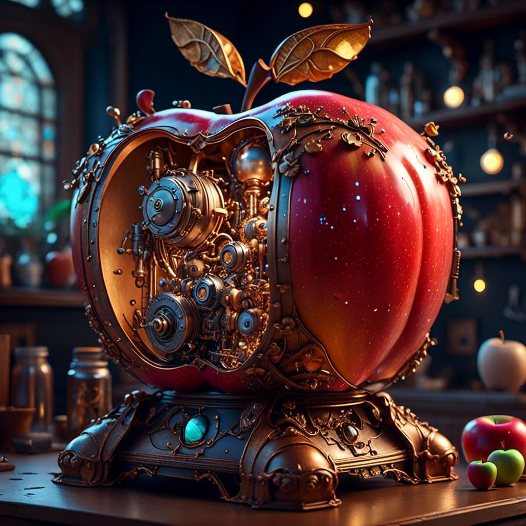 A hyperrealistic mechanical apple floats in space among bright stars. The apple is intricately detailed with shades of patina and dark gold in an Art Nouveau aesthetic.