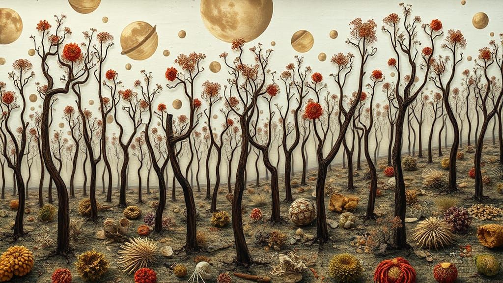 An abstract, surreal collage with fibrous textures and short, squat forms, Vineyard evokes a sense of mystery and enigma. The composition is layered with muted, continuous patterns that create a trance-like atmosphere. Elements blend into each other in a continuous montage, symbolizing the process of ...